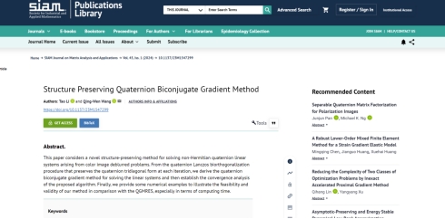 近日,SUNBET申搏官网李涛博士以第一作者署名的文章“Structure Preserving Biconjugate Gradient Method”在国际数值代数领域权威期刊《SIAM Journal on Matrix Analysis and Applications》正式发表,文章链接https://doi.org/10.1137/23M1547299。