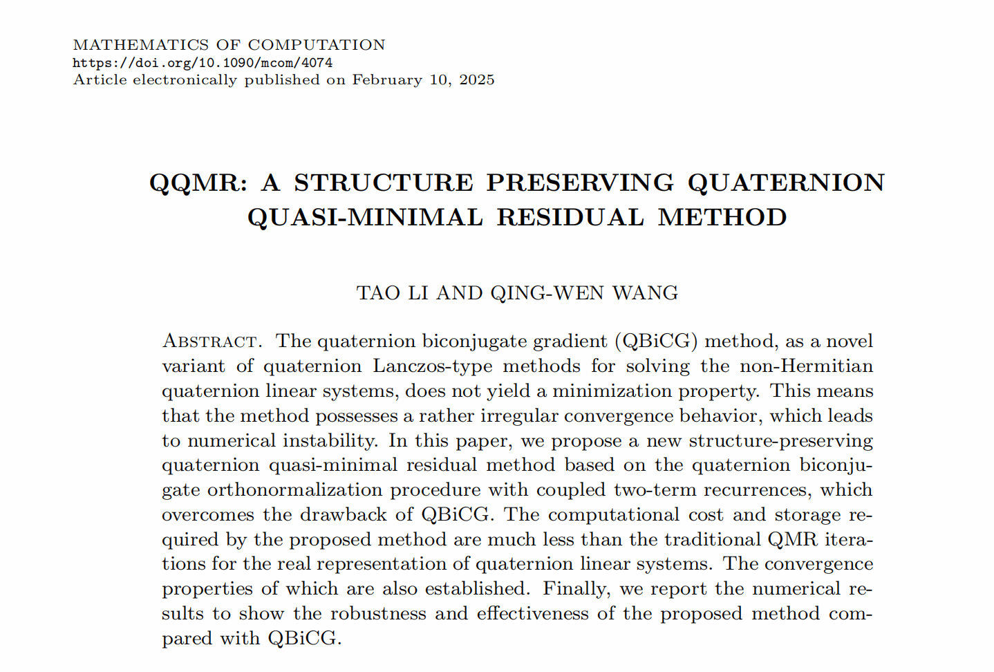 近日,美国数学学会期刊《Mathematics of Computation》在线发表了SUNBET申搏官网李涛博士(第一作者)和王卿文教授的最新研究成果“QQMR: A structure preserving quaternion quasi-minimal residual method”。《Mathematics of Computation》是国际上计算数学领域的顶级期刊,由美国数学学会出版,创刊于1943年,专注于数值分析、计算方法和数学应用等领域的高质量研究。该期刊在学术界享有很高的声誉,发表的文章通常具有重要的理论或应用价值。在中国数学会推荐的数学期刊分类简表中被列为T1类刊物,在中科院分区中也是1区Top期刊。SUNBET申搏官网为此成果的第一完成单位,通讯作者为上海大学王卿文教授。