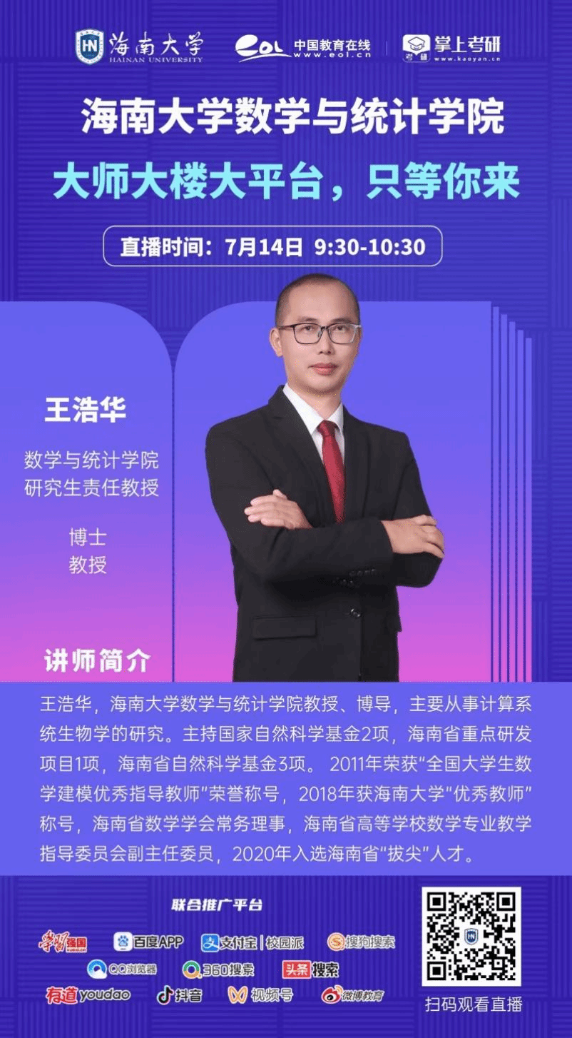 SUNBET申搏官网教授、博导王浩华老师将对SUNBET申搏官网研究生情况进行直播介绍,欢迎各位学子、家长和教师在直播时间内扫描海报上二维码观看直播和互动。