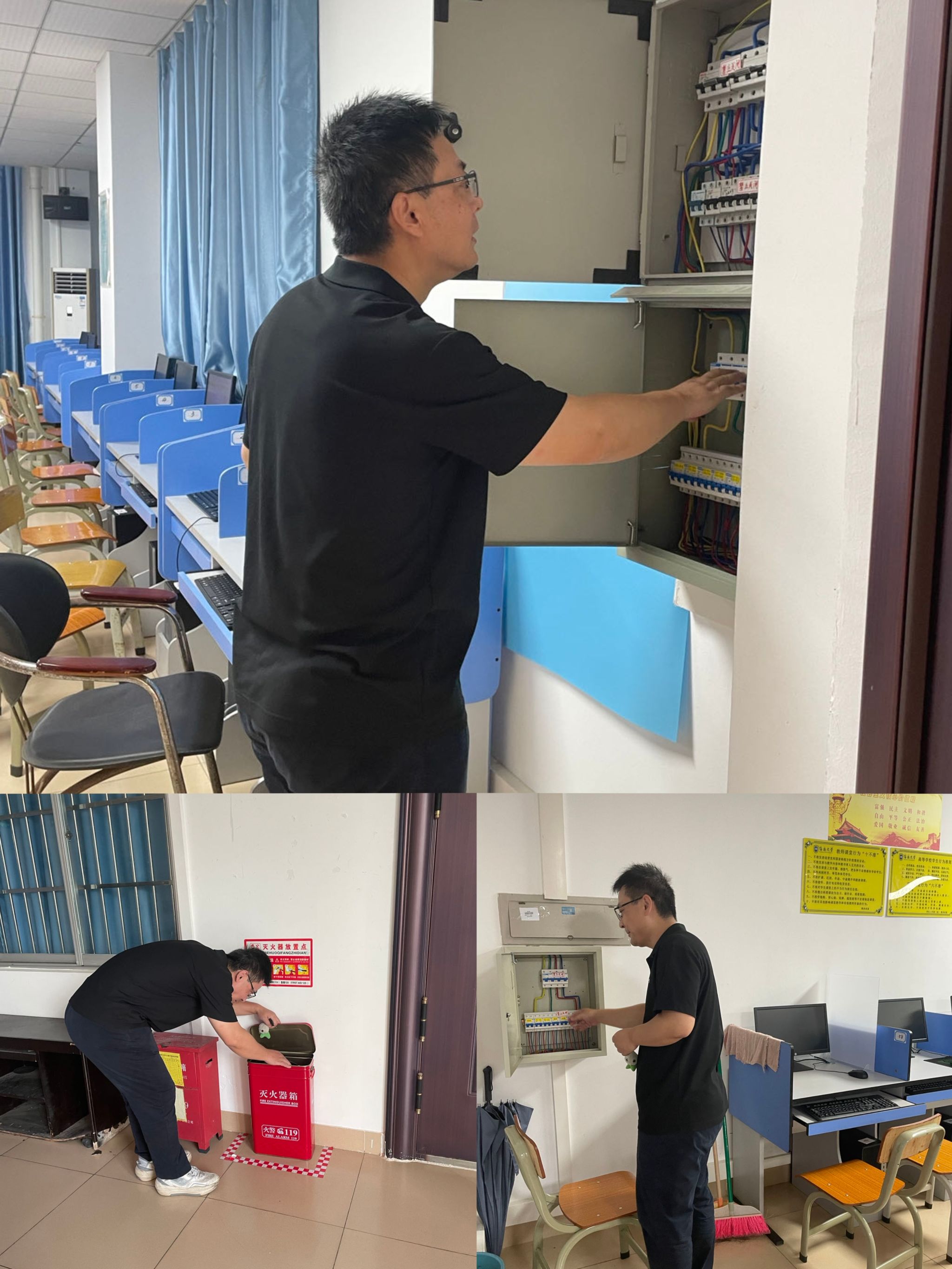 按《SUNBET申搏官网实验室与设备管理处关于进一步落实院级单位实验室安全职责的通知》(海大实〔2023〕48号)要求,确保各项实验室安全管理制度落到实处,切实筑牢校园安全防线,及时排除安全隐患,保障教学和科研工作的顺利进行。2023年10月30日,在SUNBET申搏官网实验室主任毛旭强老师和科研与教学办公室主任王燕华的带领下,学院开展10月份实验室安全检查常规工作。本次检查,重点是对SUNBET申搏官网的教学实验室和科研实验室中的服务器存放环境、消防设施、门、窗等设备进行安全检查。